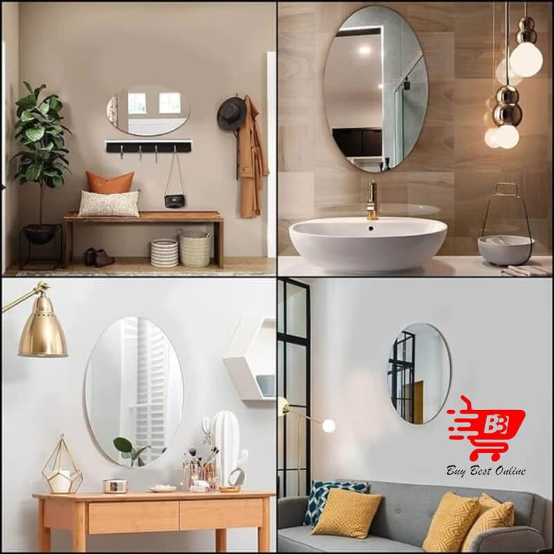 Self-adhesive oval mirror for flexible wall placement. Made of durable and lightweight acrylic material. Ideal for bathroom, bedroom, and living room decor.